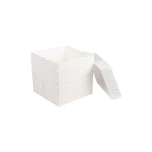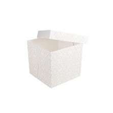 Cajas Pastelería Sin Ventana Blanca y Dorada 35,6 x 35,6 x 30,5 cm. Cajas de pastelería fabricadas en cartón nano - micro ondulado con 250 g/m². Muy resistentes y ligeras. Ideales para postres altos. Biodegradables y reciclable. Aguanta temperaturas de -18ºC hasta +70ºC. Dimensiones: 35,6 x 35,6 x 30,5 cm.
